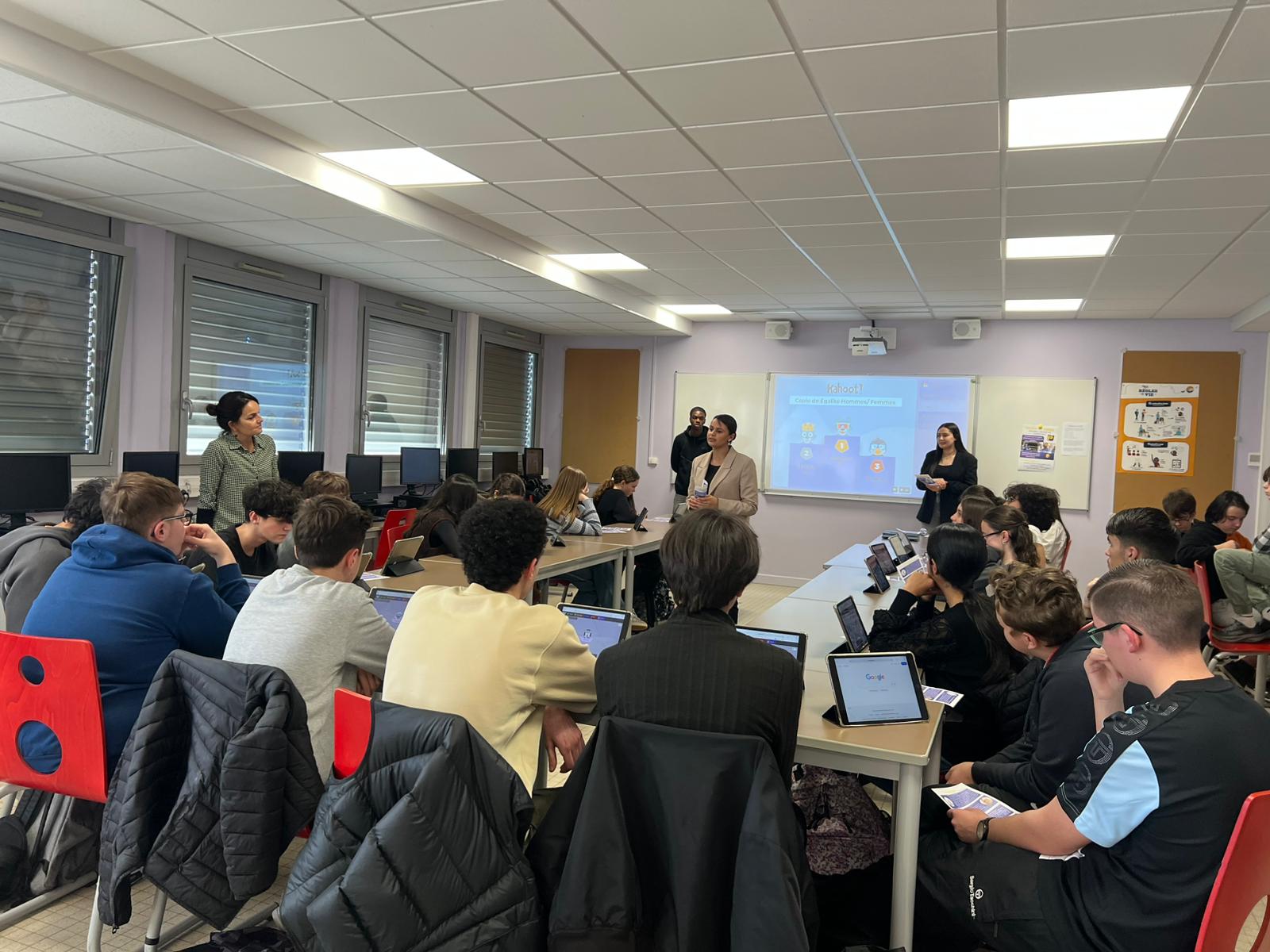Dans le cadre de leur projet sur l’égalité femmes-hommes, les étudiants de BTS SAM 1re année du lycée Algoud Laffemas sont intervenus auprès de toutes les classes de 3e du Collège Gérard Gaud à Bourg-lès-Valence, accompagnés par la référente Égalité de l’établissement.