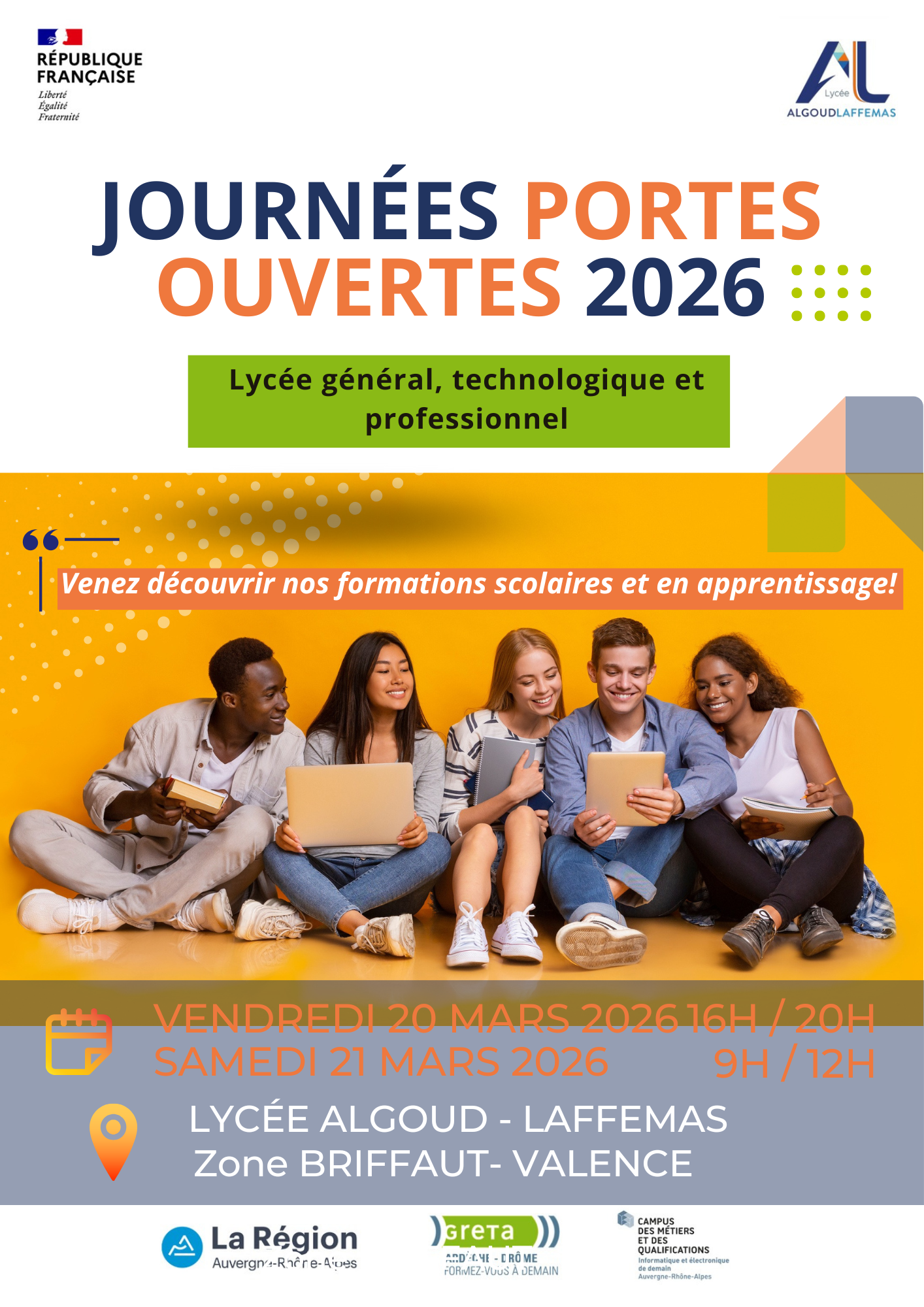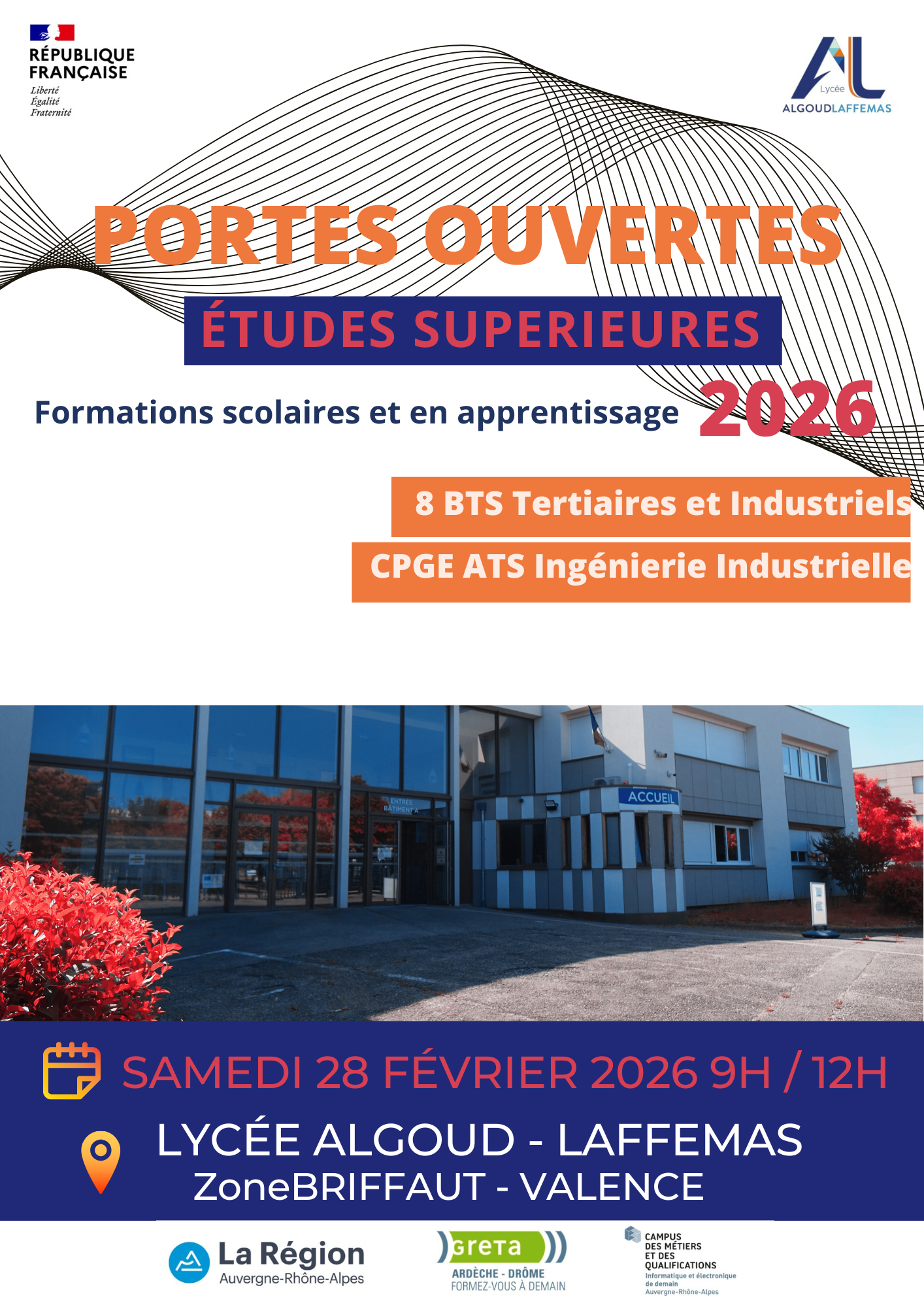 Deux journées portes ouvertes auront lieu au Lycée Algoud Laffemas. La première le 28 février pour le post-bac et le vendredi 20 et samedi 21 mars pour le pré-bac.