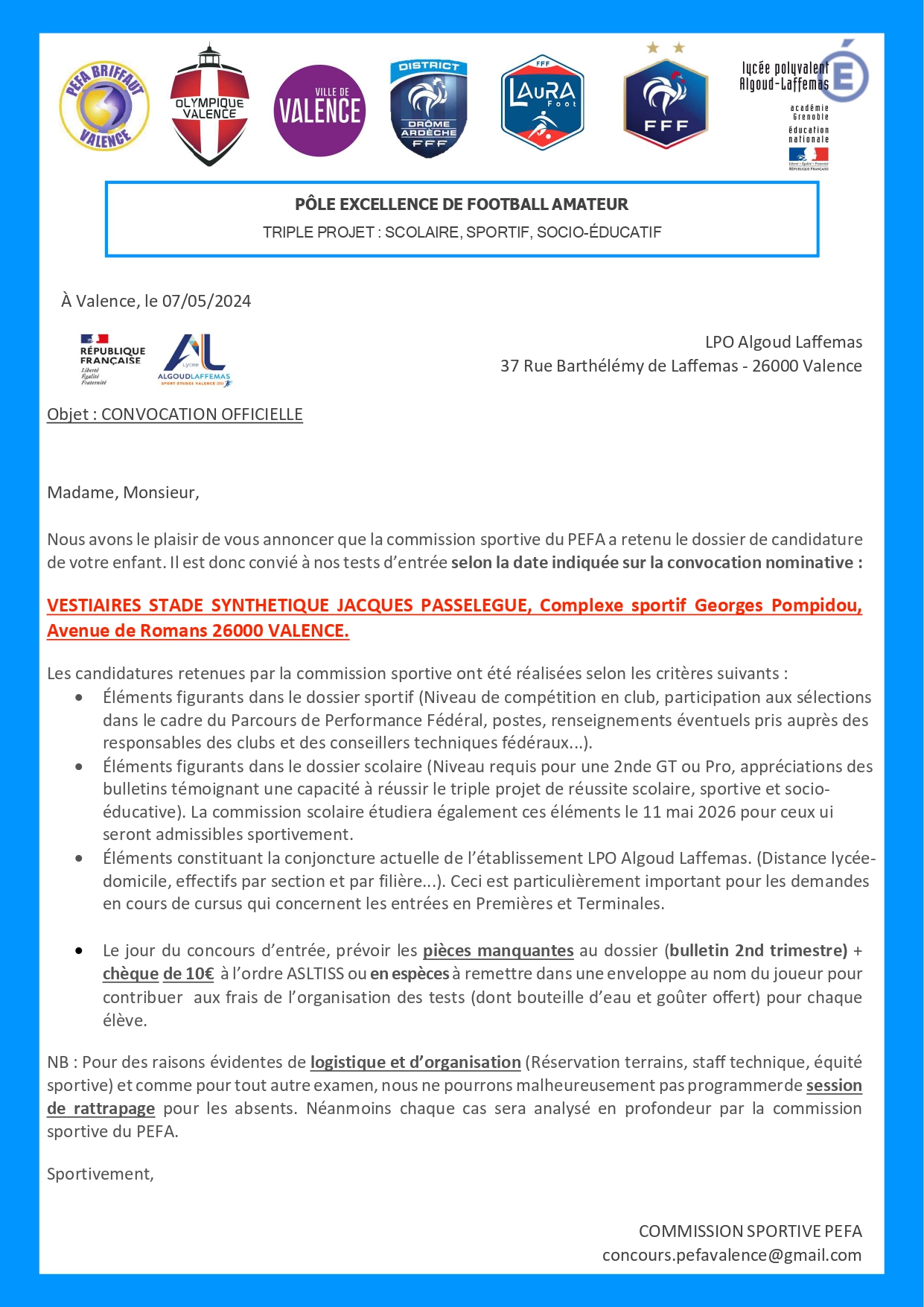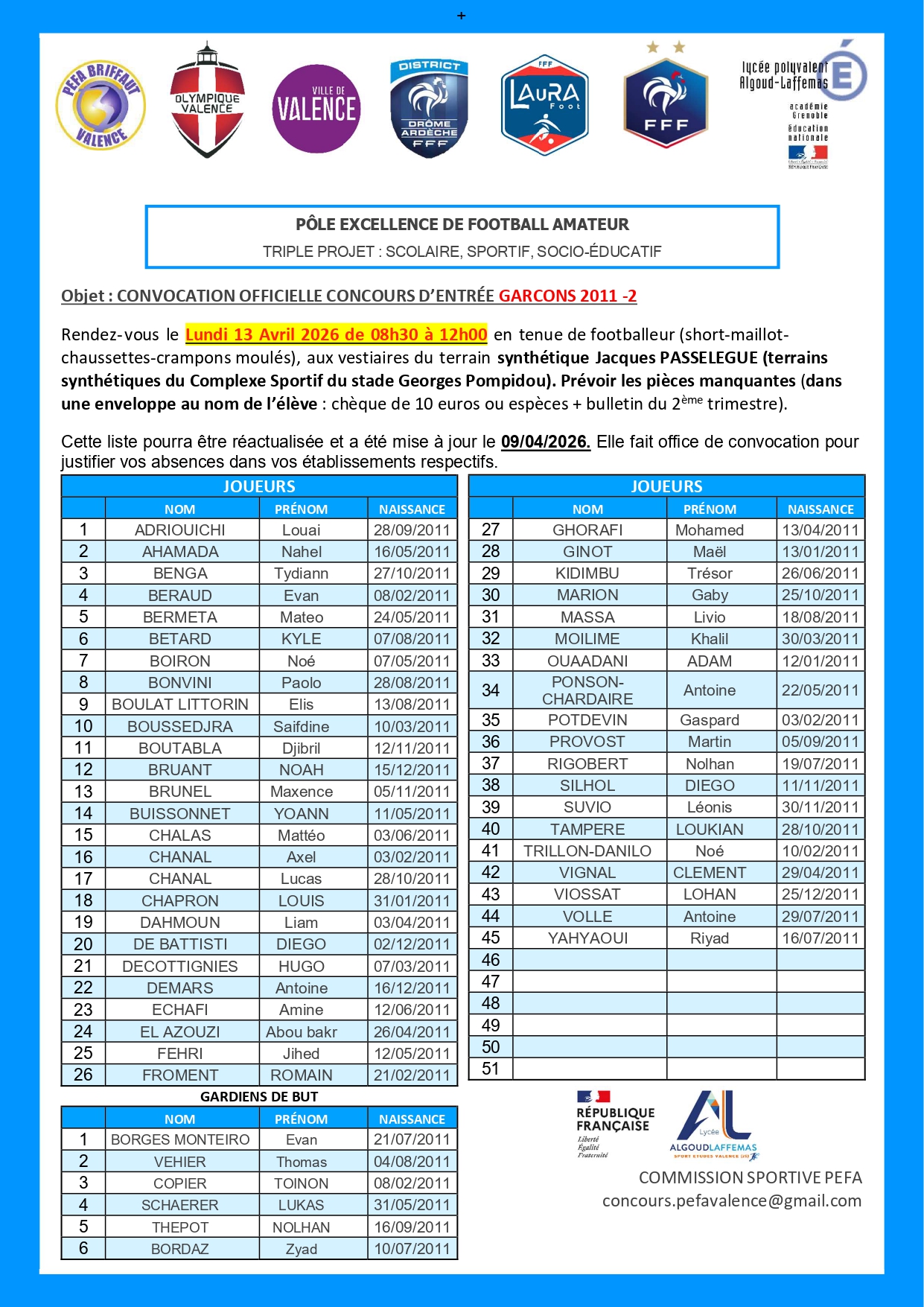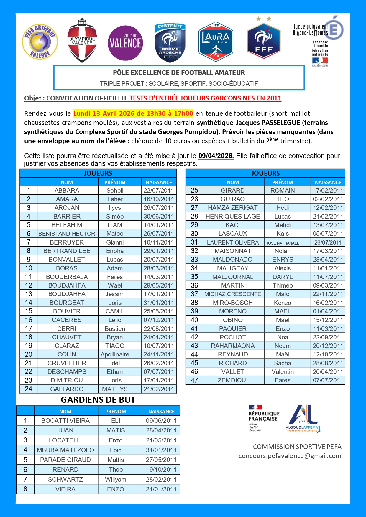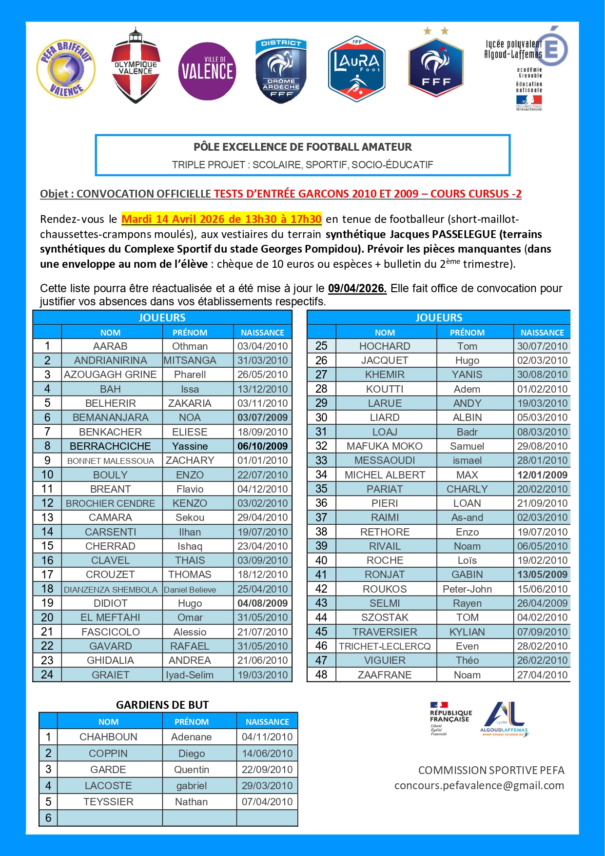 SPORT-ETUDES FOOTBALL (PEFA Valence-O.Valence) : liste des candidatures retenues pour la 1ère phase de nos tests de sélection (Garçons et Arbitrage).